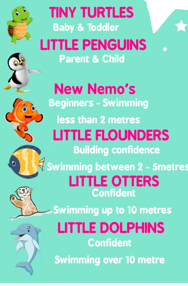 Your child develops at their own pace. We use games and songs to introduce them to the water and develop their swimming skills.